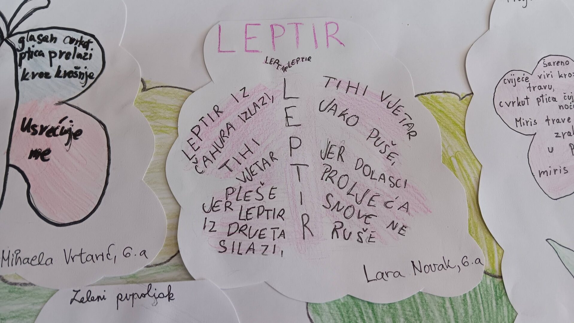 Za “zagrijavanje”, učenici su izradili jednu kratku pjesmu od jednog stiha. A nakon toga, na temelju proljetnih motiva i zadane strukture, izradili su i pjesmu od 4 stiha koju su grafički oblikovali u obliku glavnog motiva pjesme.